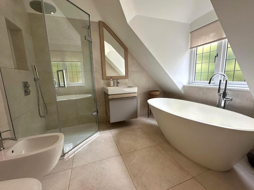 Upstairs there are six bedrooms including a beautiful Principal bedroom with dressing room and ensuite. To the first floor there are four further bedrooms, one with a dressing room, two with en-suite and a large family bath/shower room. The large 6th Bedroom runs the whole length of the 2nd floor with Velux windows and has been soundproofed making it the perfect teenage hideaway with an incorporated den/snug area.