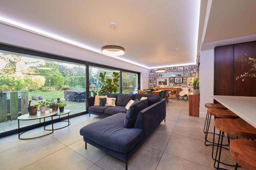 The welcoming entrance hallway immediately opens into heart of the home. Floor-to-ceiling sliding glass doors span the entire width of the property, effortlessly creating a seamless connection between the stylish interiors and the garden beyond. The stunning bespoke kitchen has ample storage, a striking central island and a cleverly concealed utility room offering storage and dedicated space for a washing machine & tumble dryer. There is a side door which provides direct garden access, complete with a hot water tap - perfect for washing muddy boots or four-legged friends!