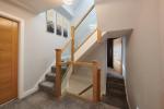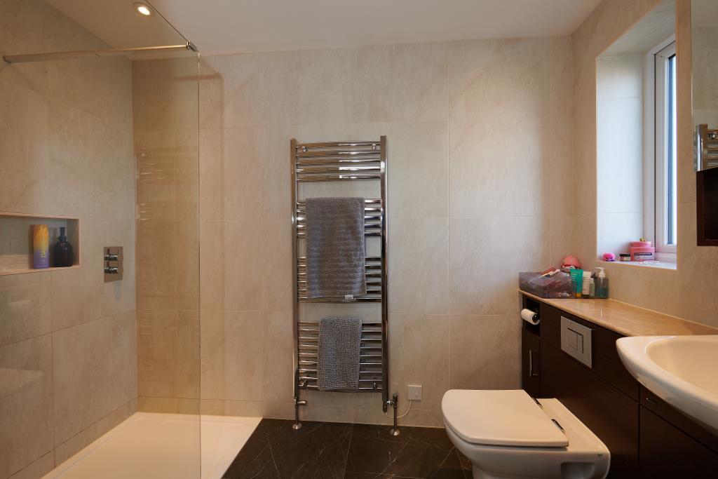 The upper level features a beautifully appointed shower room, showcasing a striking tiled feature wall, WC, and basin. The Principal bedroom offers excellent head height and abundant natural light thanks to both standard windows and Velux roof lights. This room benefits from dedicated hidden loft storage.